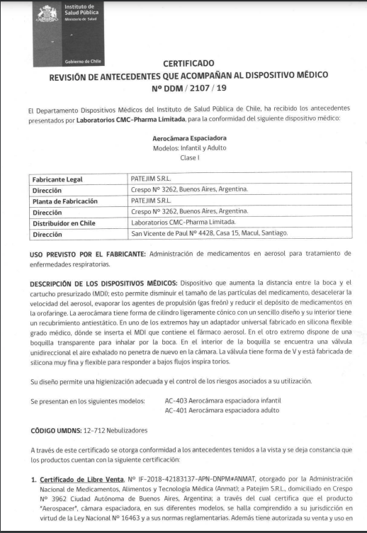 Certificaciones AeroCMC Certificado de Revisión de Antecedentes que acompañan al Dispositivo MédicoNº DDM / 2107 / 19 Descargar PDF